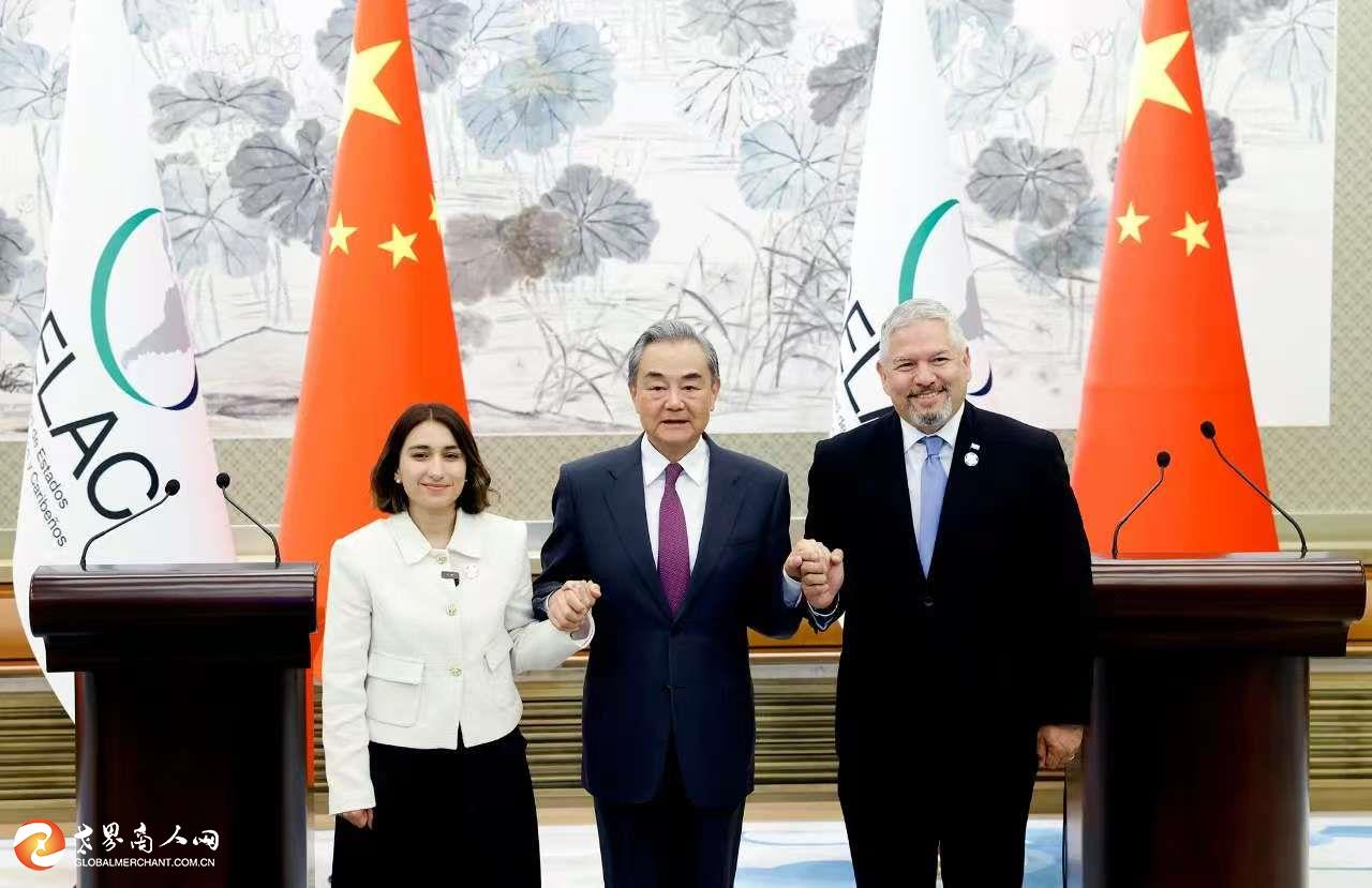 2025年5月13日,中共中央政治局委员、外交部长王毅同出席中拉论坛第四届部长级会议的拉共体“双主席”哥伦比亚及洪都拉斯外长共同会见记者并答问。
