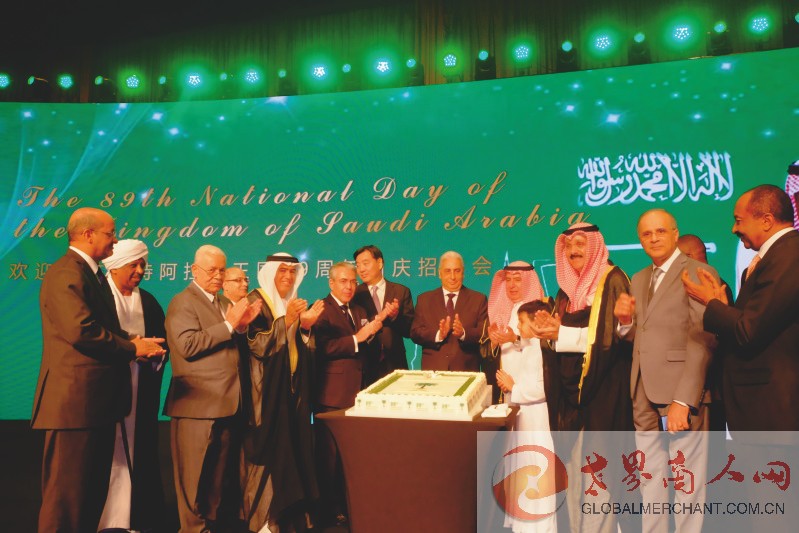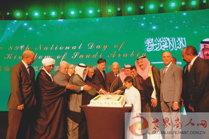 沙特驻华大携子与阿盟驻华使团各国大使共切沙特国庆89周年纪念蛋糕,分享国庆喜悦