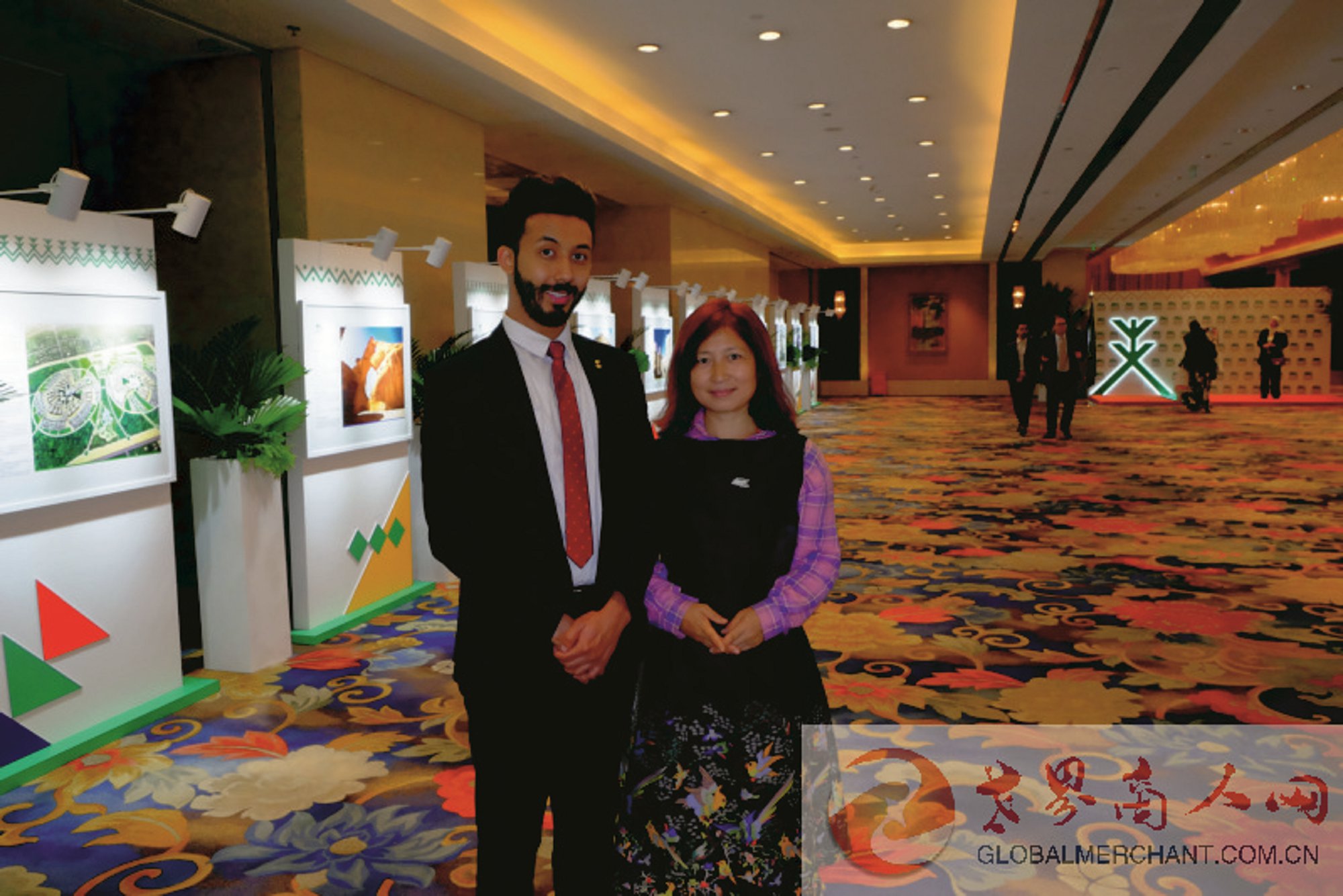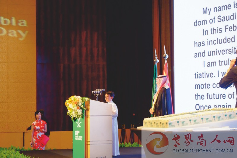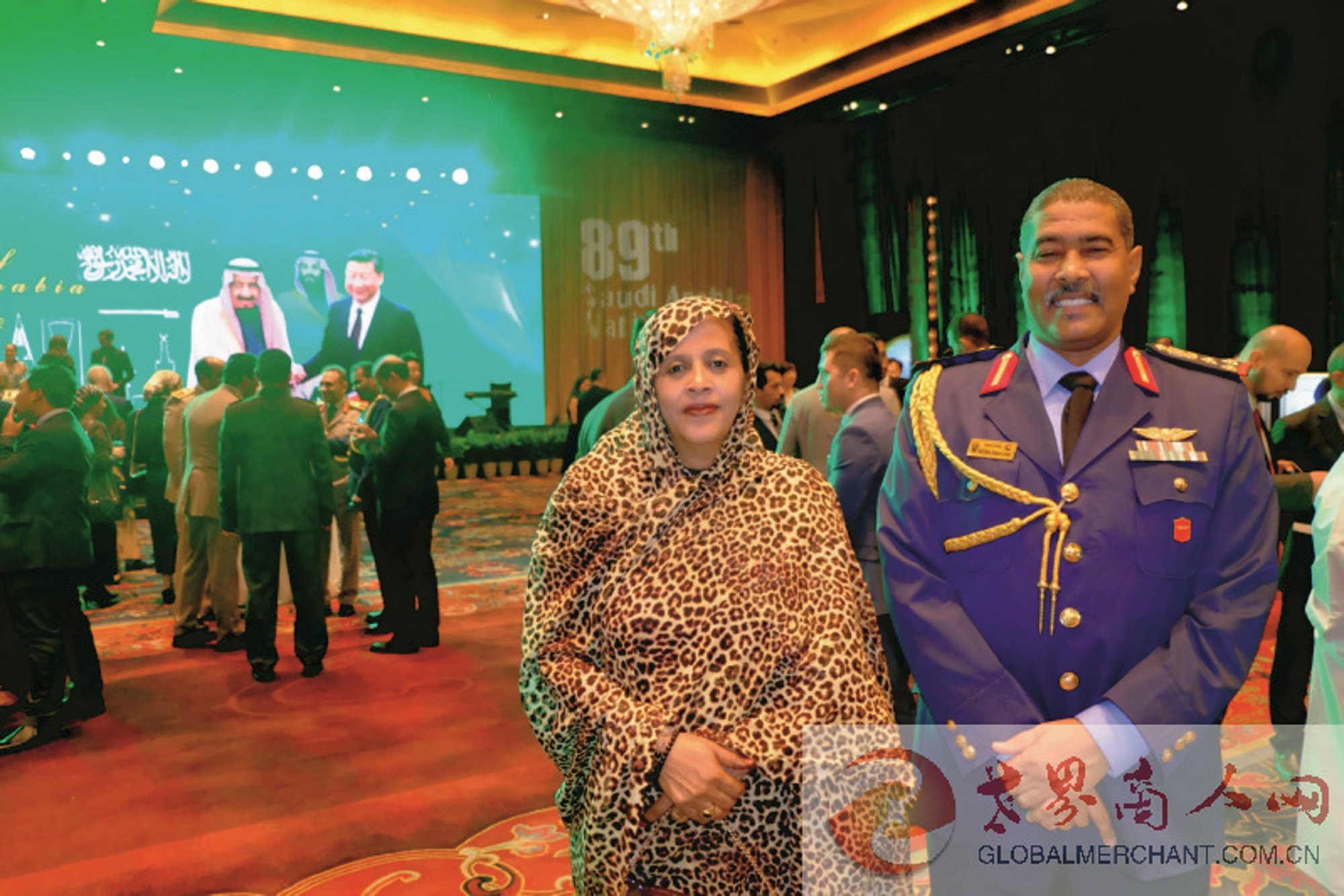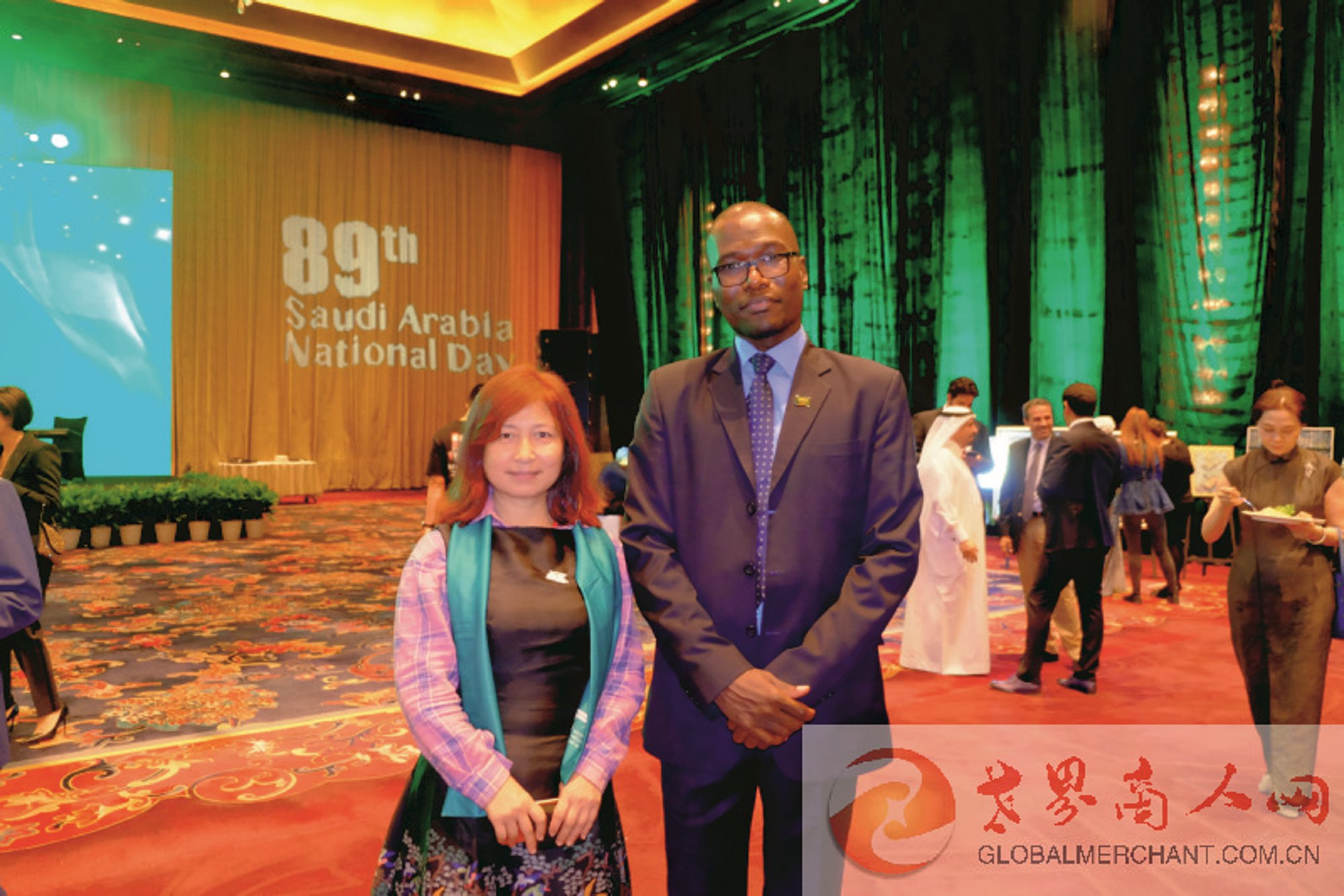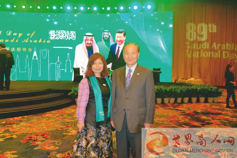 环球云链·世界商人网主编王晓玲与沙特驻华使馆公使先生在第89届沙特阿拉伯王国国庆招待会上合影