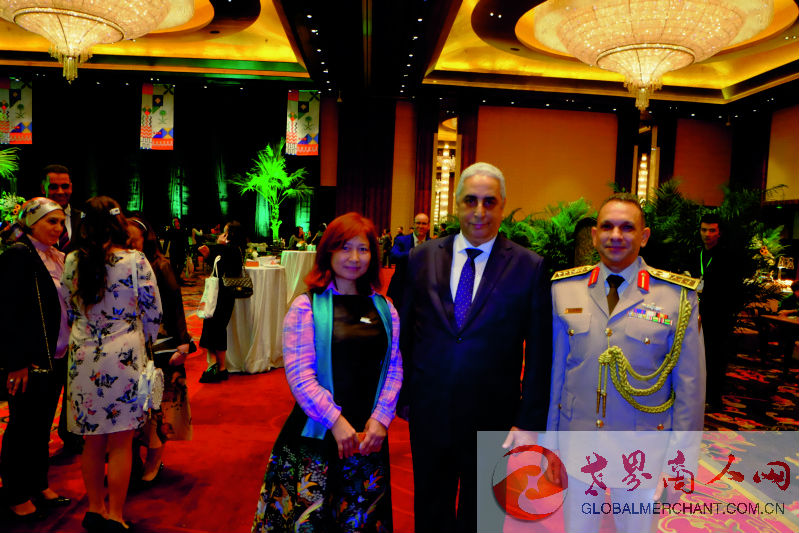 环球云链·世界商人网主编王晓玲与埃及驻华大使奥萨马·马格杜布及埃及驻华使馆武官先生在第89届沙特阿拉伯王国国庆招待会合影