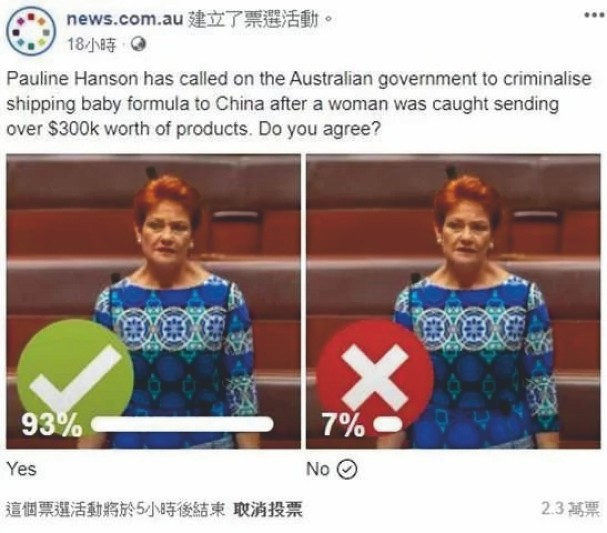 据媒体5月19日报道,澳洲女议员保利娜·汉森表示,在遭到关税打击之后,澳大利亚可以采取婴儿配方奶粉的对华出口限制措施来扳回一局。有意思的是,澳大利亚人普遍认为应该支持这位女议员的决定。有媒体对这一建议组织了投票,竟然有93%的澳大利亚人支持奶粉不对华出口的建议