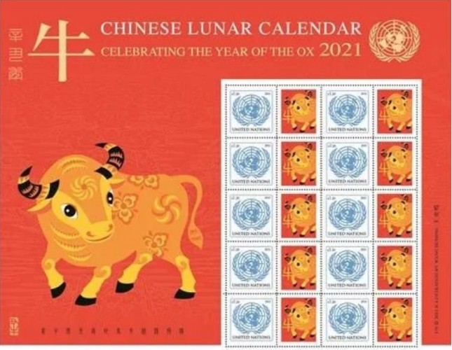 联合国邮政管理局于1月22日在纽约发行中国农历辛丑年特别版邮票版张,以庆祝2021年中国农历新年。