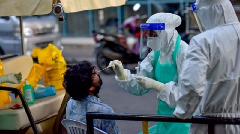 一名医务工作者在马累(Male)擦拭一名男子进行新冠病毒测试