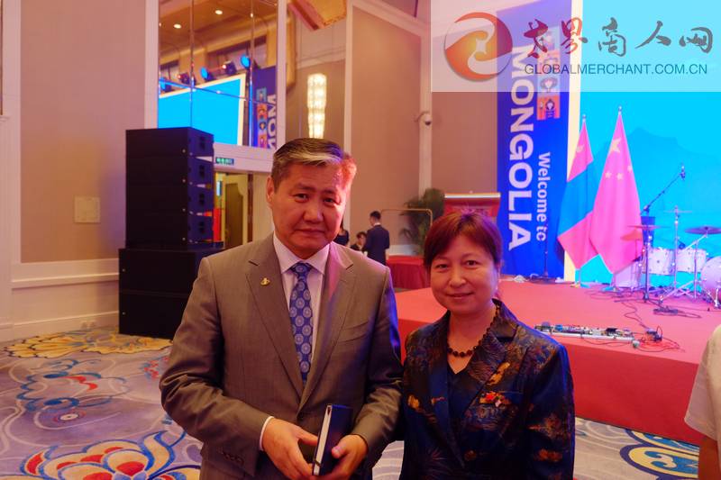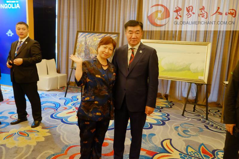 侨世华贸国际贸易集团总经理、世界商人网总编王晓玲与蒙古国道路和运输发展部部长BYAMBATSOG Sanda阁下在中国—蒙古国经贸合作论坛交流合影