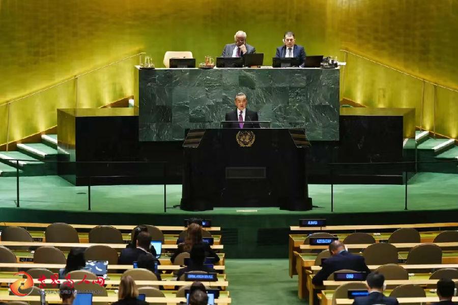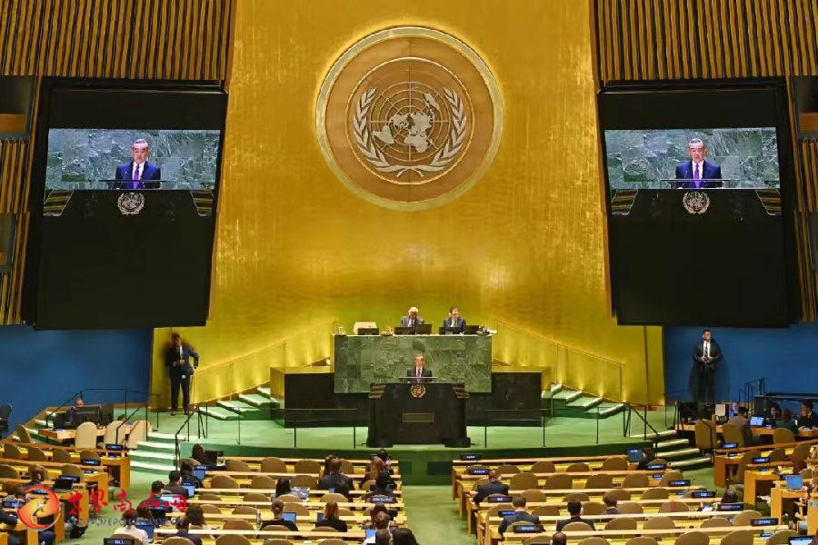 当地时间2024年9月28日,中共中央政治局委员、外交部长王毅在纽约联合国总部出席第79届联合国大会一般性辩论,并发表题为《 继往开来  砥砺前行  携手共建人类命运共同体 》的演讲。