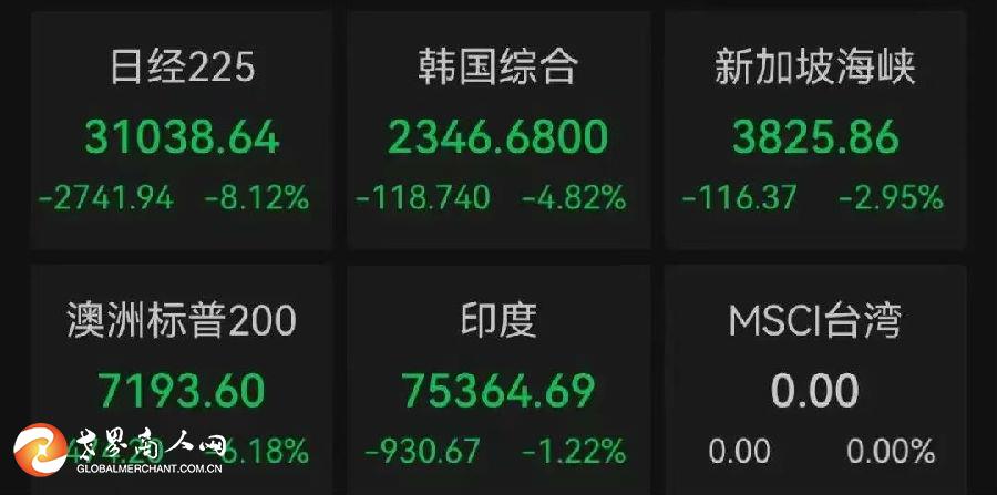 亚洲其他股市周一也出现大跌,日经225指数期货、东证指数期货在触及跌停板后暂停交易。韩国股市同样大幅下挫,韩国交易所在KOSPI 200指数期货下跌5%后,启动了停牌机制,并暂停程序化交易5分钟。澳大利亚S&P/ASX 200指数开盘下跌2.75%,随后跌幅迅速扩大,截至发稿跌超6%。新加坡股市7日开盘后延续下行走势,海指下跌7.29%。