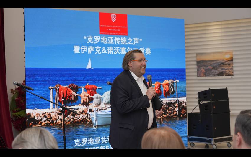 2025年5月29日,“克罗地亚传统之声”主题音乐会在克罗地亚共和国建国日庆祝活动上演。低音提琴师提霍米尔· 霍伊萨克,克罗地亚传统乐器坦布拉琴演奏家菲利普· 诺沃塞尔从克罗地亚远道而来,为中国观众和各国驻华使节献上二重奏。克罗地亚驻华大使米海林阁下携使馆全体外交官热情迎接出席音乐会的各国嘉宾:欧洲各国驻华大使,各国驻华使馆外交官以及部分克罗地亚在华侨民,中国克罗地亚友好人士共150余人出席了克罗地亚建国日音乐会。
