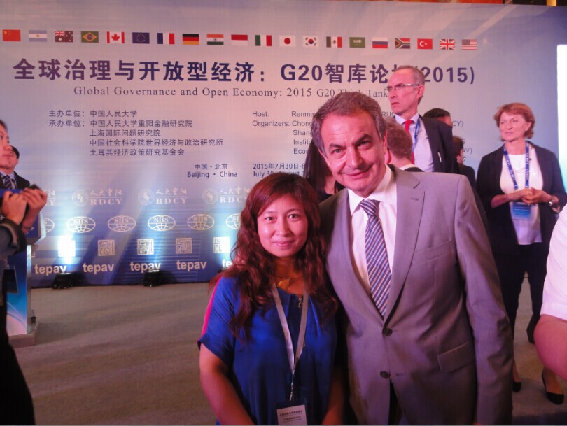 亚太城市网主编王晓玲在G20智库论坛(2015)开幕式上与西班牙前首相何塞·路易斯·萨帕特罗先生合影