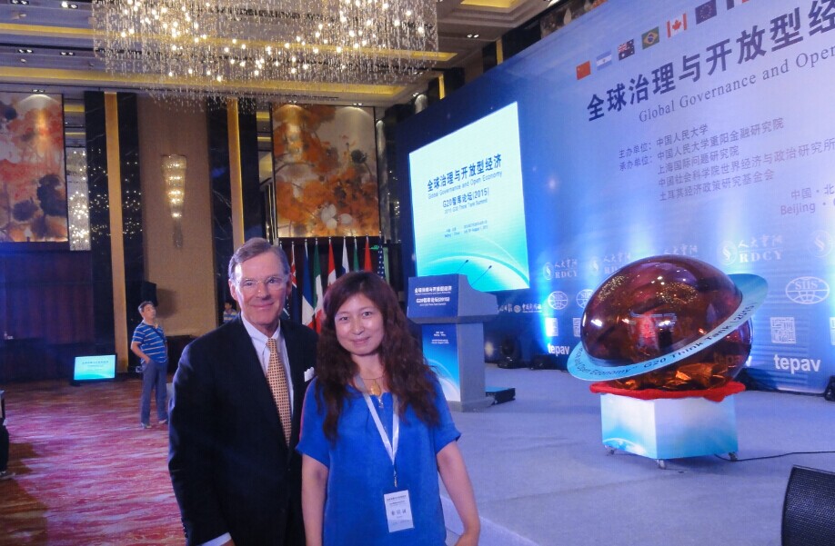 亚太城市网主编王晓玲在G20智库论坛(2015)开幕式上与国际商会主席、来自美国的哈罗德·麦格劳三世先生合影