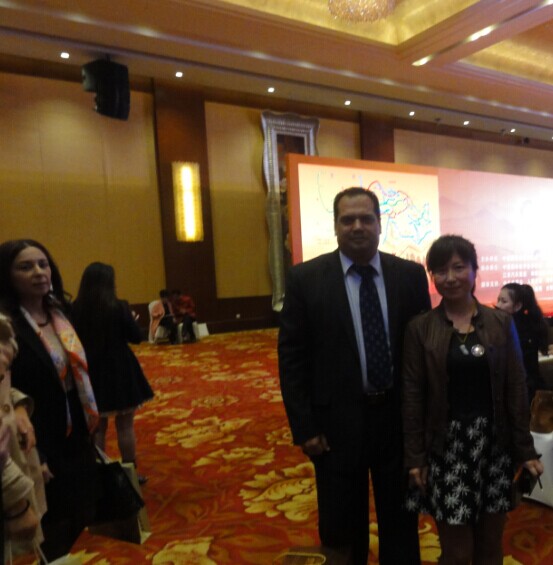亚太城市网主编王晓玲在首届丝绸之路国际论坛上与埃及驻华大使馆文化参赞侯赛因·伊卜拉欣(Hussein Ibrahim Morsy)博士合影留念