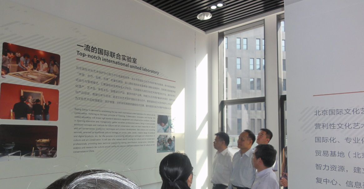 歌华文化发展集团总工陈刚(右1)陪同山西省商务厅副巡视员田国玉一行参观考察国家对外文化贸易基地