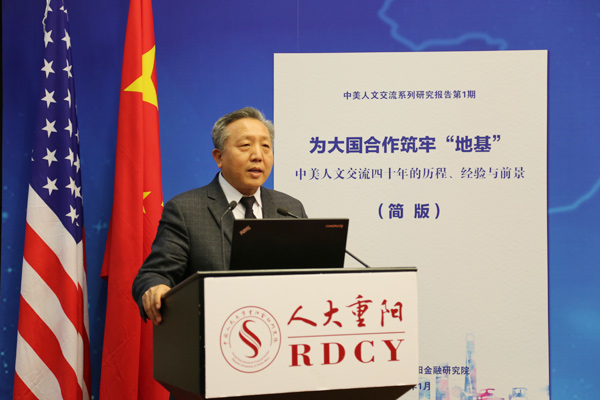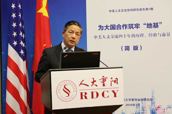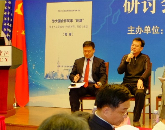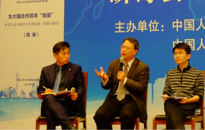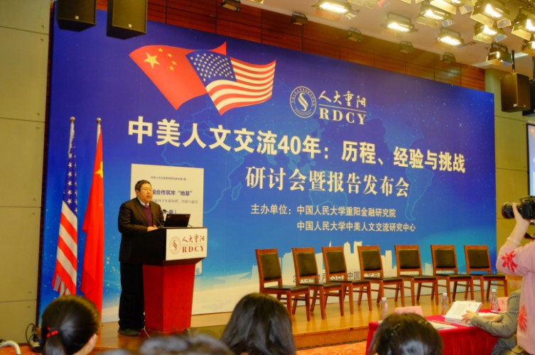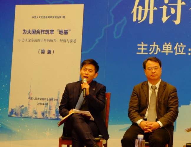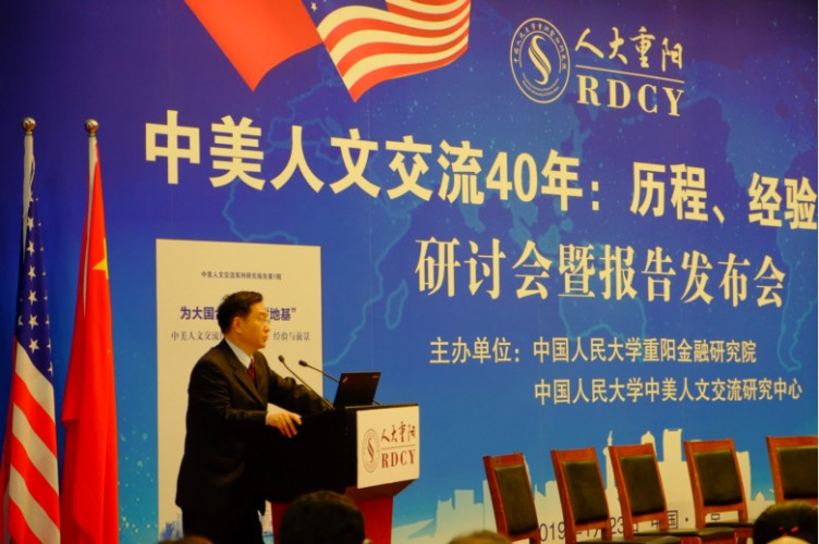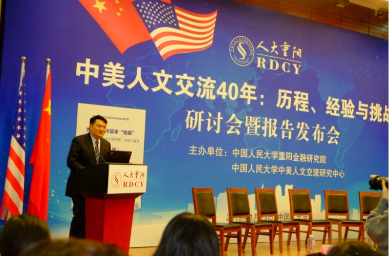 2019年1月23日,“中美人文交流40年:历程、经验与挑战”研讨会暨报告发布会在北京人民大学举行。该论坛由中国人民大学重阳金融研究院和中国人民大学中美人文交流研究中心联合主办。中国人民大学重阳金融研究院执行院长兼中美人文交流研究中心执行主任王文主持了开幕式。中国人民大学副校长兼中美人文交流研究中心主任吴晓球,中国公共外交协会副会长、外交部前部长助理胡正跃,教育部中外人文交流中心主任杜柯伟出席开幕式并致辞。