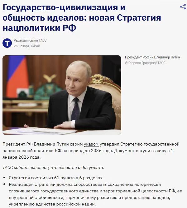 据塔斯社11月25日报道,俄罗斯总统普京签署总统令,正式批准《2036年前俄罗斯联邦国家民族政策战略》(以下简称“《战略》”)。该文件首次明确将俄罗斯定位为“文明型国家”,并设定了一系列量化发展目标,于2026年1