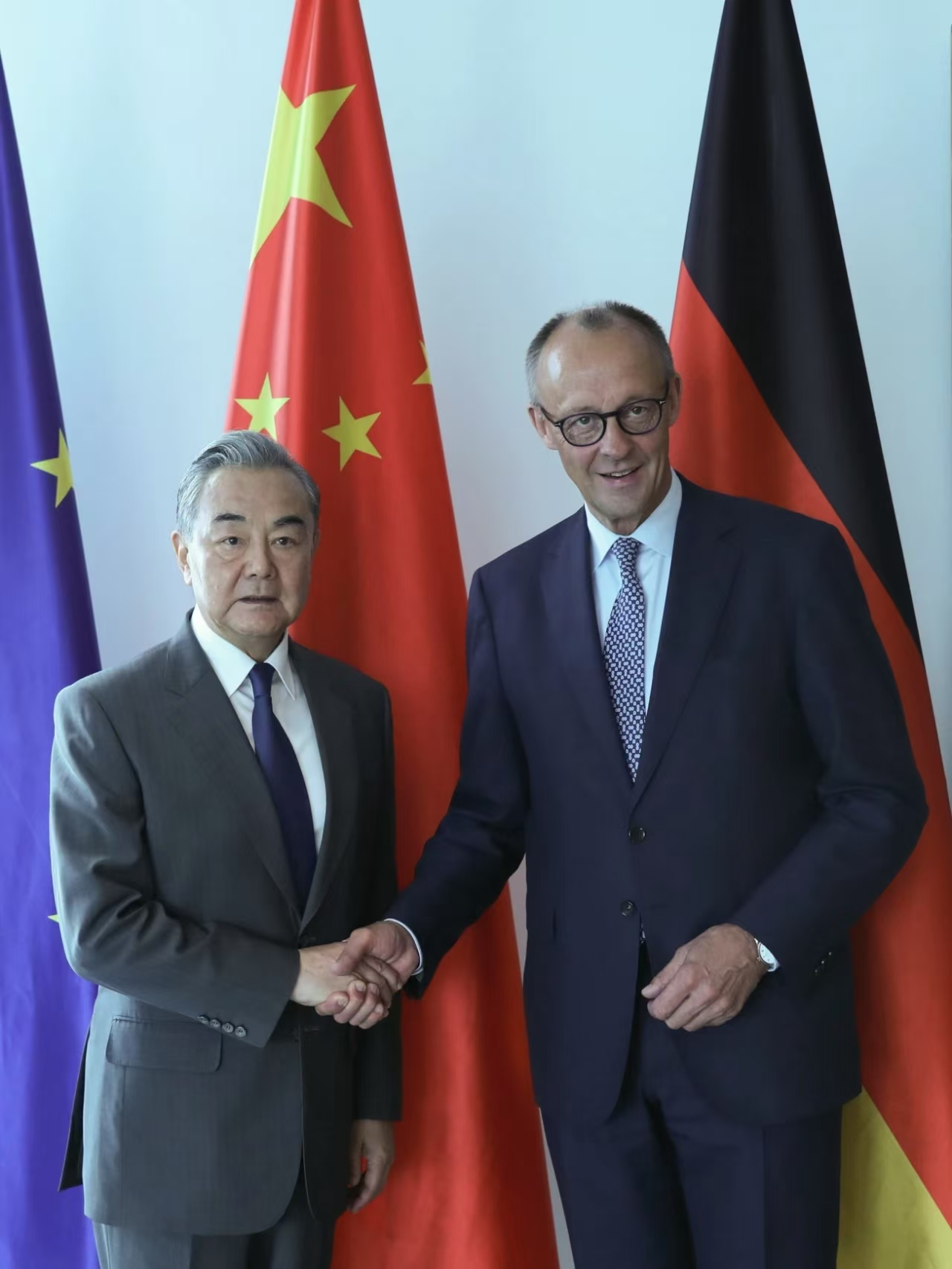 当地时间2025年7月4日,德国总理默茨在柏林会见中共中央政治局委员、外交部长王毅。默茨表示,德中关系发展良好,政治经贸等各领域合作持续发展。德方愿同中方坚持开放互利,促进公平贸易,携手应对危机挑战,这符合双