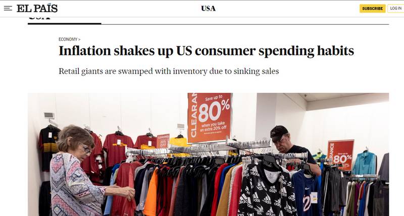 西班牙《国家报》英文版网站截图近期,西班牙《国家报》英文版网站报道了高通胀下的美国。报道称,美国人越来越少使用汽车,购买更便宜的食品,外出就餐越来越少,减少在服装和耐用品上的支出,并选择在平价商店购物。