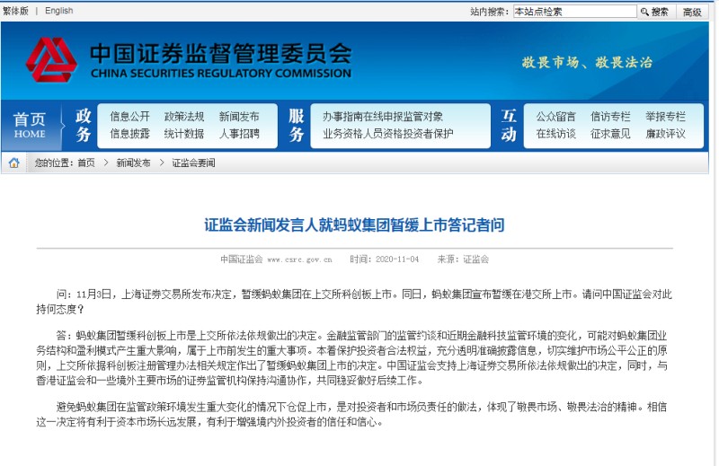 证监会新闻发言人就蚂蚁集团暂缓上市答记者问