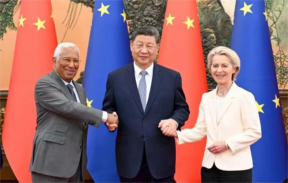 7月24日上午,国家主席习近平在北京人民大会堂会见来华举行第二十五次中国-欧盟领导人会晤的欧洲理事会主席科斯塔和欧盟委员会主席冯德莱恩。习近平指出,中欧建交50年来,交流合作成果丰硕,既成就彼此又惠及世界,