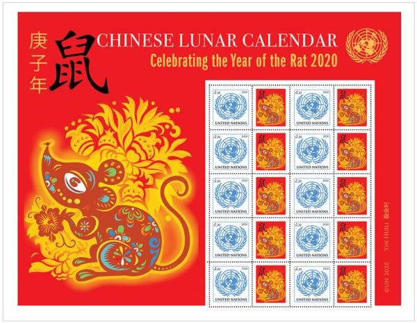 联合国邮政管理处于2010年5月开始发行以“中国农历生肖”为内容的邮票版张,庚子鼠年邮票是该系列的第11版。