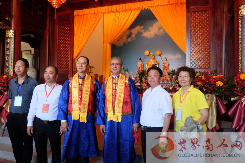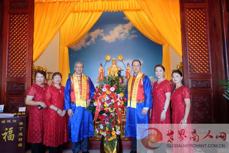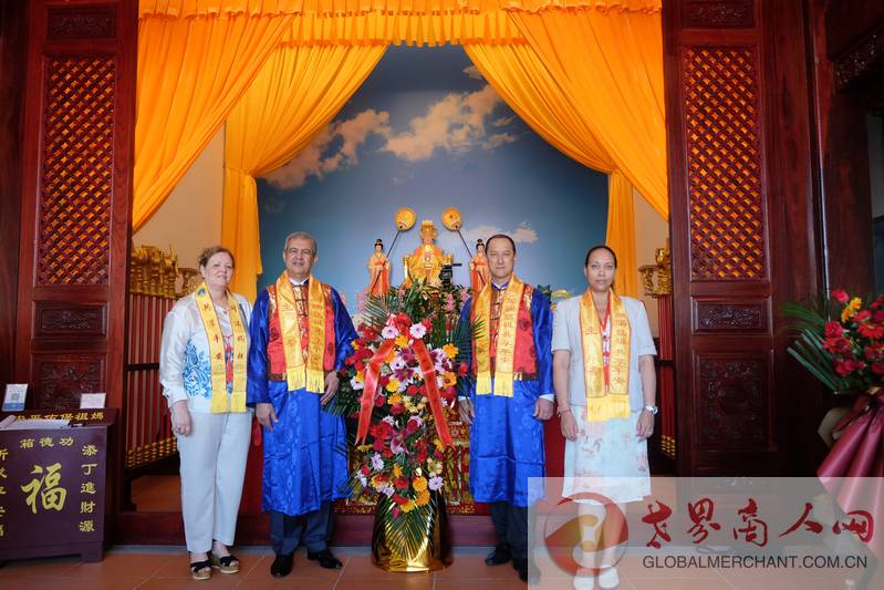2022"妈祖秋祭"文化系列活动开幕式暨秋祭大典活动圆满举行,世界商人网总编、环球云链国际旅行社社长王晓玲与毛里求斯共和国驻华大使王纯万阁下,阿尔及利亚驻华大使阁下及中华妈祖文化交流协会领导在懿明楼妈祖神像前合影