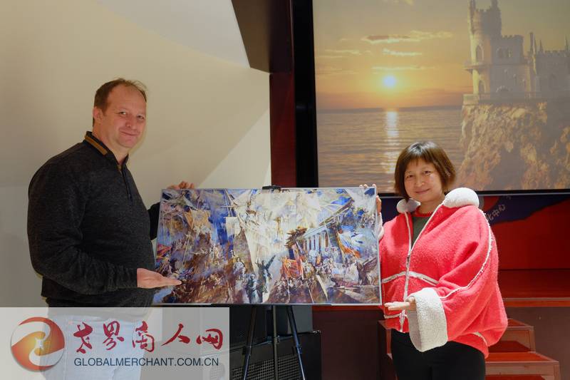 世界商人网创始主编、环球云链国际旅行社总经理王晓玲与俄罗斯摄影记者簇拥一幅画:此画为纪念克里米亚加入俄联邦9周年而作-----战争与和平