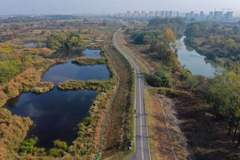 2022年11月12日,运动爱好者们在浙江省杭州市余杭区瓶窑镇北湖草荡生态湿地的健身游步道上参加健康跑比赛(无人机照片)。新华社记者 徐昱 摄