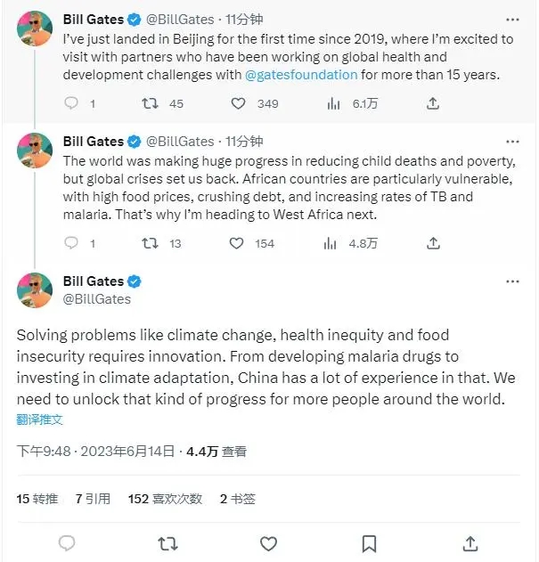 IT之家6月14日闪讯速报,微软创始人比尔·盖茨6月14日在推特发文称已抵达北京,这是他自2019年以来首次抵达北京,很高兴能与盖茨基金会一同应对全球健康和发展挑战的伙伴们会面。