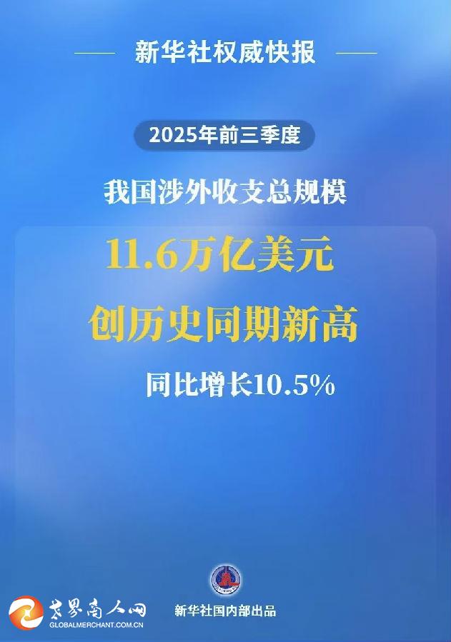国家外汇管理局10月22日发布数据显示,9月,企业、个人等非银行部门跨境收支合计1.37万亿美元,环比增长7%。今年前三季度,我国涉外收支总规模为11.6万亿美元,创历史同期新高,同比增长10.5%。