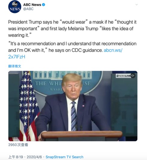 据美国广播公司(ABC)消息,当地时间4月5日,美国总统特朗普谈到了自己是否戴口罩一事,他表示,如果他认为戴口罩很重要,他会戴。特朗普还提到第一夫人梅拉尼娅倒是喜欢“戴口罩的主意”。