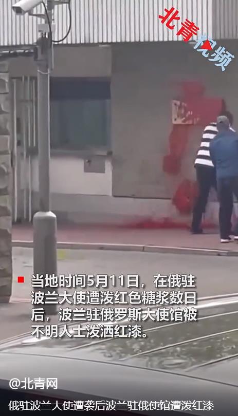 据北青网报道,当地时间5月11日,在俄驻波兰大使遭泼红色糖浆数日后,波兰驻俄罗斯大使馆被不明人士泼洒红漆。